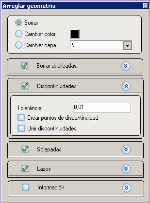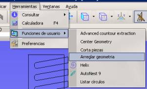 Una vez abierto el fichero que contiene la geometría iremos a la opción del menú Herramientas -> Funciones de Usuario -> "Arreglar geometría" y activaremos las diferentes casillas seleccionando en cada una de ellas los valores de tolerancia deseados.